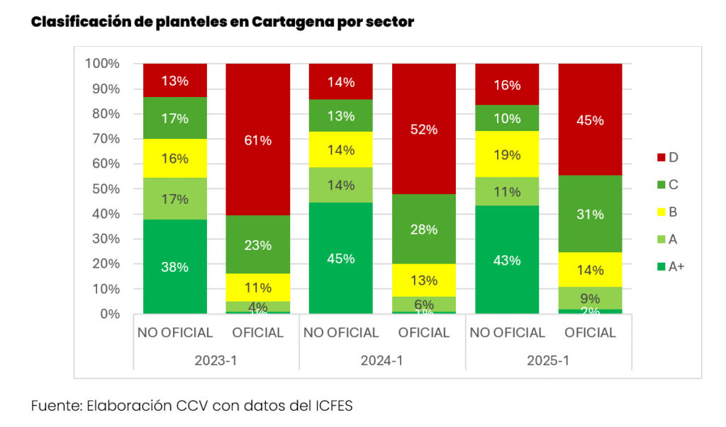 La calidad sigue siendo un reto: el 52% de todos los colegios aún está en las categorías más bajas. El sector oficial es el que más avanza, la proporción en D disminuyó al 45% y A–A+ subió al 11%, mientras que en lo no oficial se evidencia una leve desmejora, con menos colegios en A+ (43%) y más en D (16%), una señal de alerta sobre su desempeño reciente.