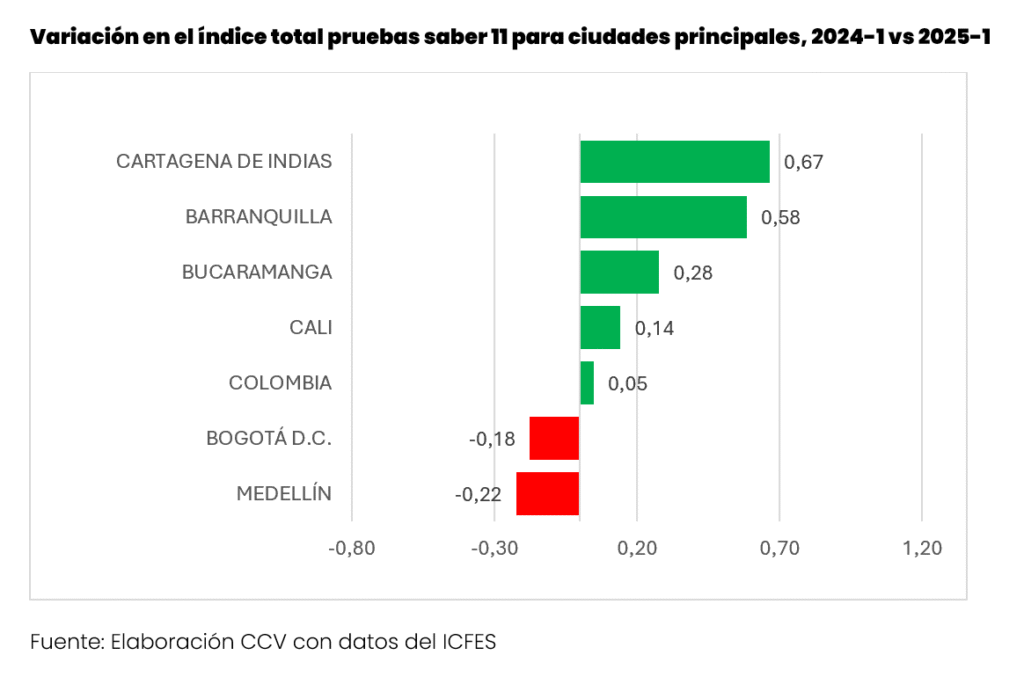 Este progreso está impulsado principalmente por el desempeño del sector oficial, donde Cartagena lidera el avance entre las principales ciudades, con 1,21 puntos adicionales. Por el contrario, en los colegios no oficiales se aprecia una tendencia nacional de desmejora. Cartagena disminuyó 0,10 puntos, mientras ciudades como Medellín registraron caídas cercanas a los 2 puntos.