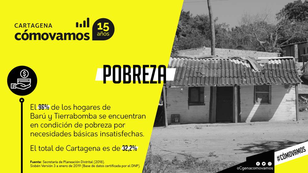 Los corregimientos de la isla de Tierrabomba y Barú presentan cifras alarmantes en cuanto a pobreza: el 96% de los hogares de la zona están clasificadas como pobres por tener una de las siguientes necesidades básicas insatisfechas (NBI): viviendas inadecuadas, servicios precarios o inexistentes, hacinamiento crítico, niños en edad escolar que no asisten a la escuela o alta dependencia económica, mientras que en Cartagena la cifra es de 32,2%. A su vez, más de la mitad (55%) de los hogares están en condiciones de miseria.